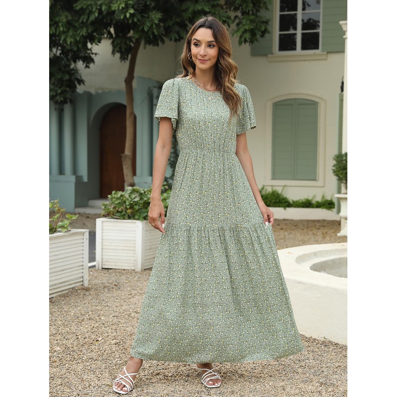 • 2. Features: Classic Round Neckline, Flutter Short Sleeves, Flowy And Tiered Hemline Is Full Of Elegance. Elastic Waist Provides A Comfortable Fit And Show Off Charming Waistline, Two Functional Side Pockets, Back Button Keyhole For Easy Wearing, Ditsy Floral Print Be A Bohemian Look, Maxi Length.
