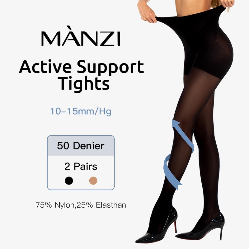 - MANZI Active Support Tights: These tights are fitted with flat seams, a deep extra flat waistband, reinforced toes, as well as anti-fatigue compression. All these features make wearing them comfy, easy, enjoyable. A collection of designs that compress your legs to aid circulation and stop you from feeling tired