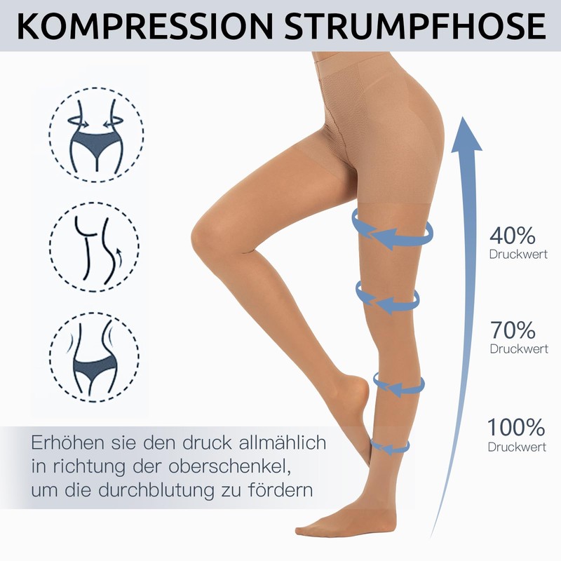 - Compression tights: these women's tights have comfortable compression with a pressure of 10-15 mmHg on the calves, relieving edema and relieving tired legs all day long. These women's support tights are perfect for everyday activities. Note: This is not a medical device with graduated compression