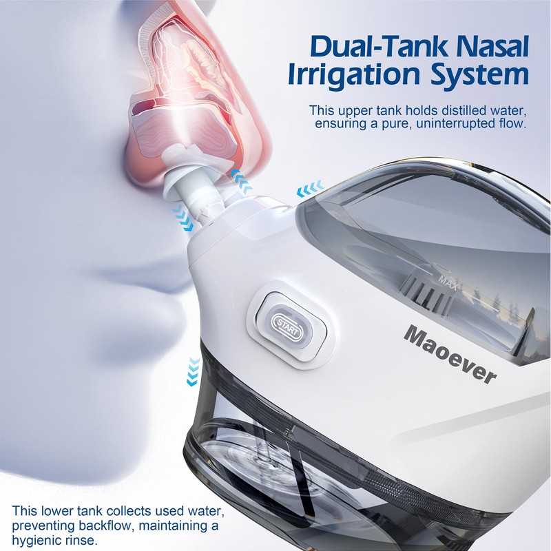 The MAOEVER Two-Tank Nasal Irrigation System offers an effective and hygienic solution for nasal care. With separate tanks for clean and dirty water, this easy-to-use device helps clear congestion, alleviate sinus pressure, and improve breathing comfort. Ideal for daily use, it provides gentle, thorough irrigation, making it a perfect tool for maintaining nasal hygiene and promoting sinus health.