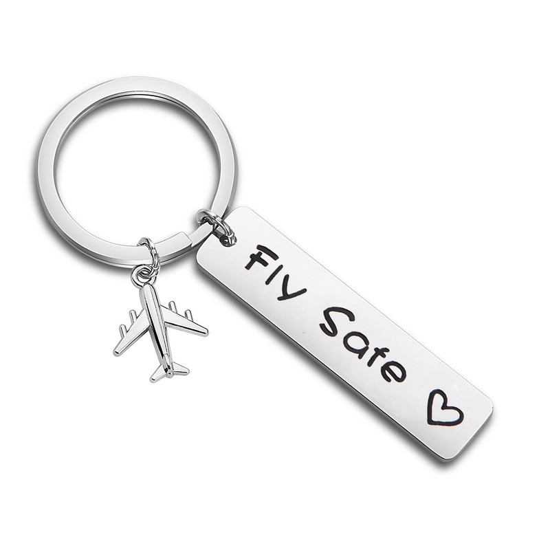 - This keychain makes the perfect gift for the frequent traveler in your life, flight attendant, or pilot. It reads "Fly safe" with a stamped heart and airplane charm.