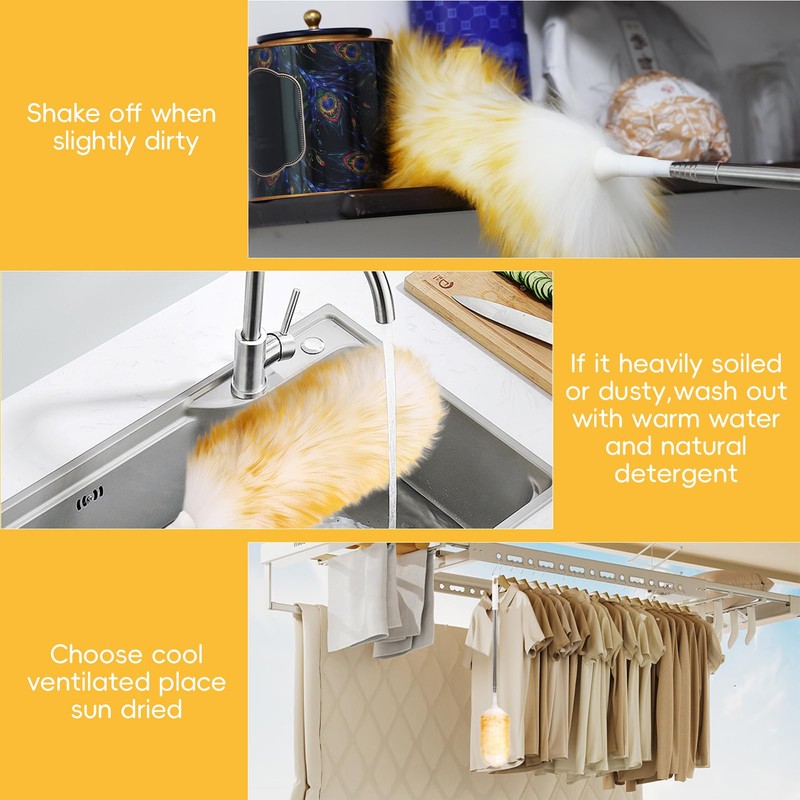 - Applicable Scenarios:This Lamb wool dusters for cleaning extendable can be used for daily dust handling, such as tabletops, plant surfaces, can also be used to clean some high-altitude sanitation facilities, such as wiping ceilings, chandeliers, air conditioners, ventilation openings, walls, and other difficult to reach and tricky areas.