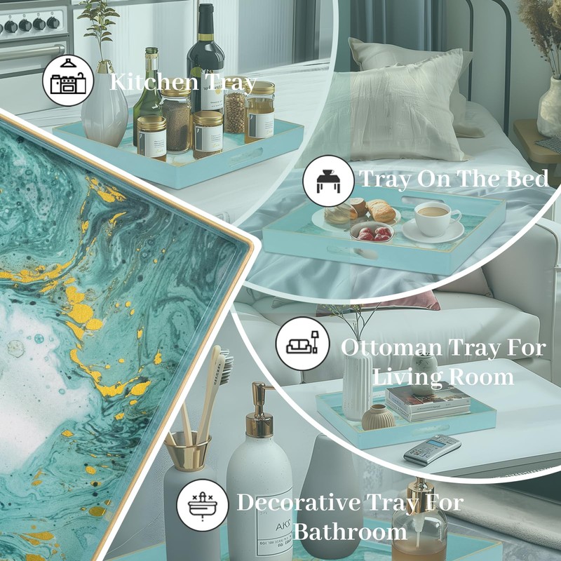 - VERSATILITY: Whether they're corralling perfumes and accessories on the vanity or simply staging a display of potted succulents and flickering tea lights, this understated coffee table turquoise tray is sure to tie your ensemble together in effortless style. Versatility to use as a perfume tray, square vanity tray for bathroom, jewelry tray, accessory tray, makeup tray