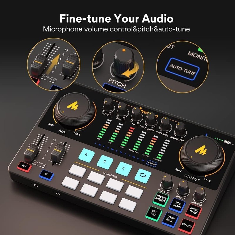 • [Enjoy a Personalized Podcasting Atmosphere]: The audio interface mixer has six reverb modes that you can adjust freely, 12-step auto-tune, 3 modifiable tones (Treble, mid-range, bass), and pitch changer knobs. Each microphone input is independently controlled, and pro features like sidechain, music-only, and loopback switches are included