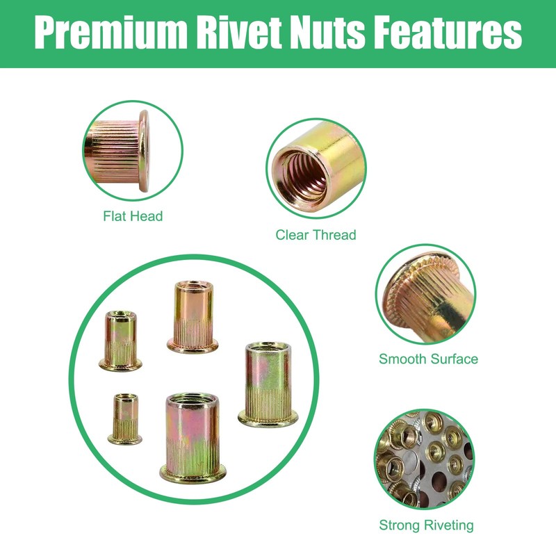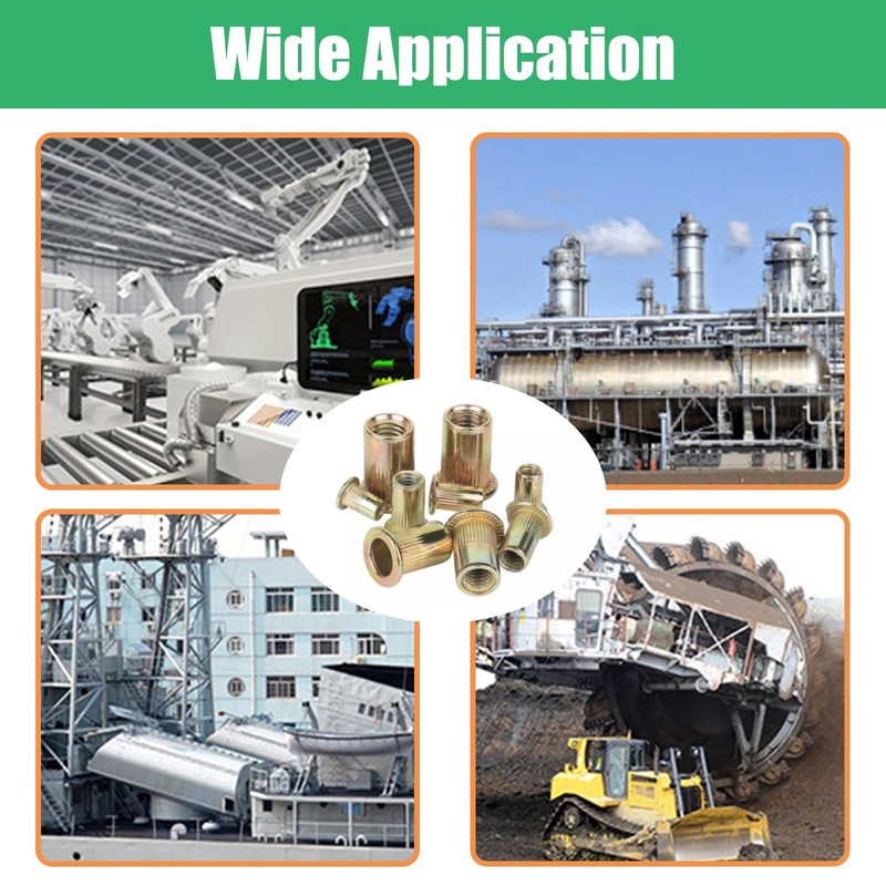 - WIDE APPLICATION: Rivet nuts are widely used in furniture, home appliances, decoration, electrical equipment, automotive, construction and renovation, ship repair, industries, etc,.