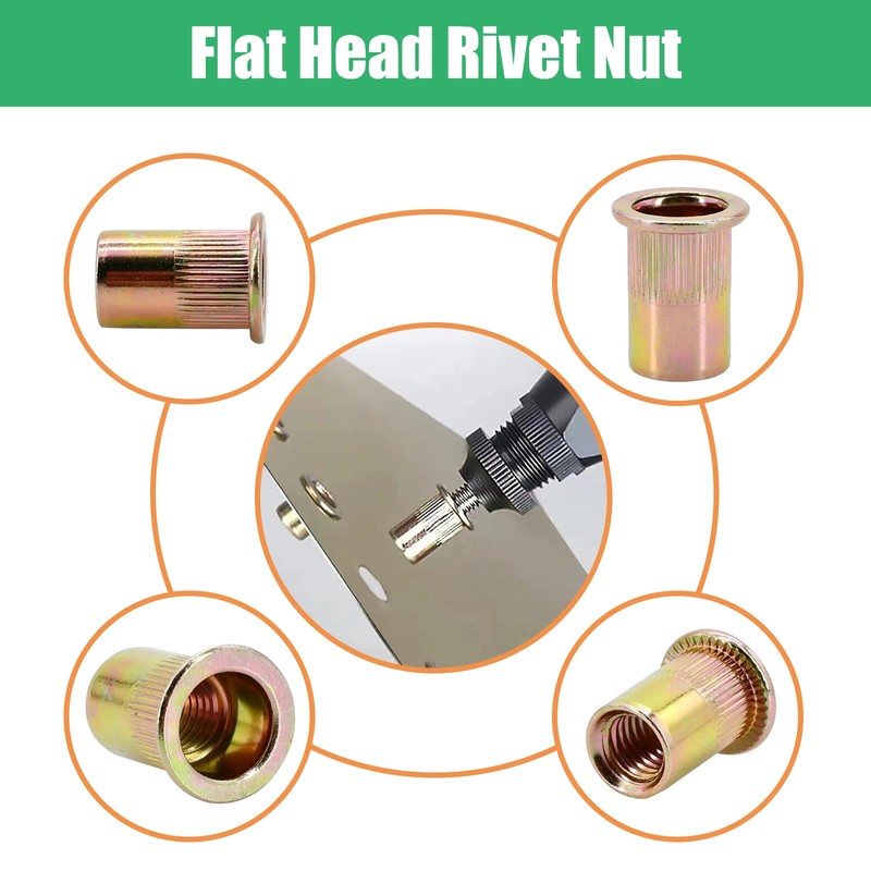 - SIZE DETAILS & PACKAGE INCLUDES: 100 pcs 1/4"-20UNC flat head threaded insert rivet nut, It is packed in a transparent box, convenient storage and safe to use.