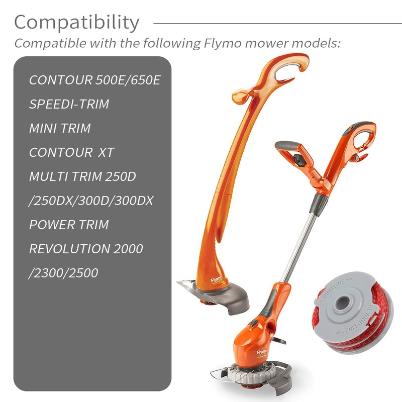 - 【Compatible Models】Compatible with Flymo Contour, Contour XT, Contour 500 XT, Contour 500E, Contour 700, Power Trim(PNC 9648641), Power Trim 500 XT, Power Trim 500/700 (PNC 9648596/7), Mini Trim, Mini Trim Auto ST/XT, Mini Trim Plus XT, Mini Trim Contour XT,Auto XT, Auto Mini Trim, Auto Plus, Speedi-Trim, Multi Trim 250D, Multi Trim 250DX, Multi Trim 300D, Multi Trim 300DX, Revolution 2000, Revolution 2300, Revolution 2500,Twist 'n' Edge.