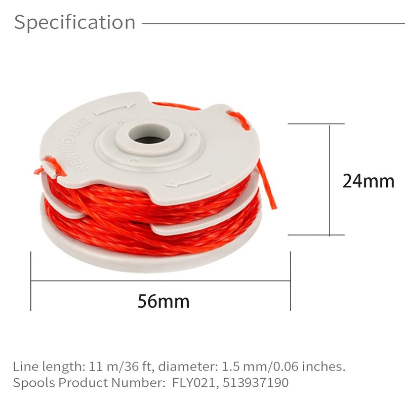 - 【Packing list】 4 x FLY021/513937190 replacement trimmer spool. Spool specifications: Line length: 11 m/36 ft, diameter: 1.5 mm/0.06 inches.