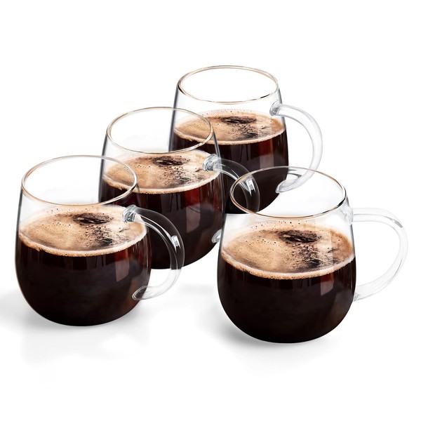 MAQQL Coffee Cup Set of 4, high borosilicate glass cups, clear glass coffee cups, large glassware set, 16 ounce glass cups with handles, can also be given as gifts