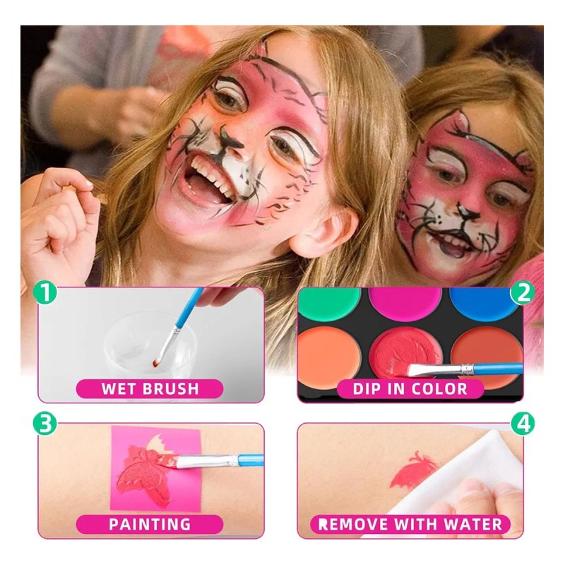 Nuestros kits de pintura facial están fabricados con ingredientes colorantes activados por agua, no tóxicos, hipoalergénicos y de calidad cosmética, por lo que son seguros para todos los niños y adultos con piel sensible. La fórmula es semiblanda, se activa con el agua, es húmeda y no grasa. Sus ingredientes de calidad cosmética y su fórmula probada en laboratorio se secan al instante y proporcionan un acabado mate opaco de larga duración y resistente a los borrones.