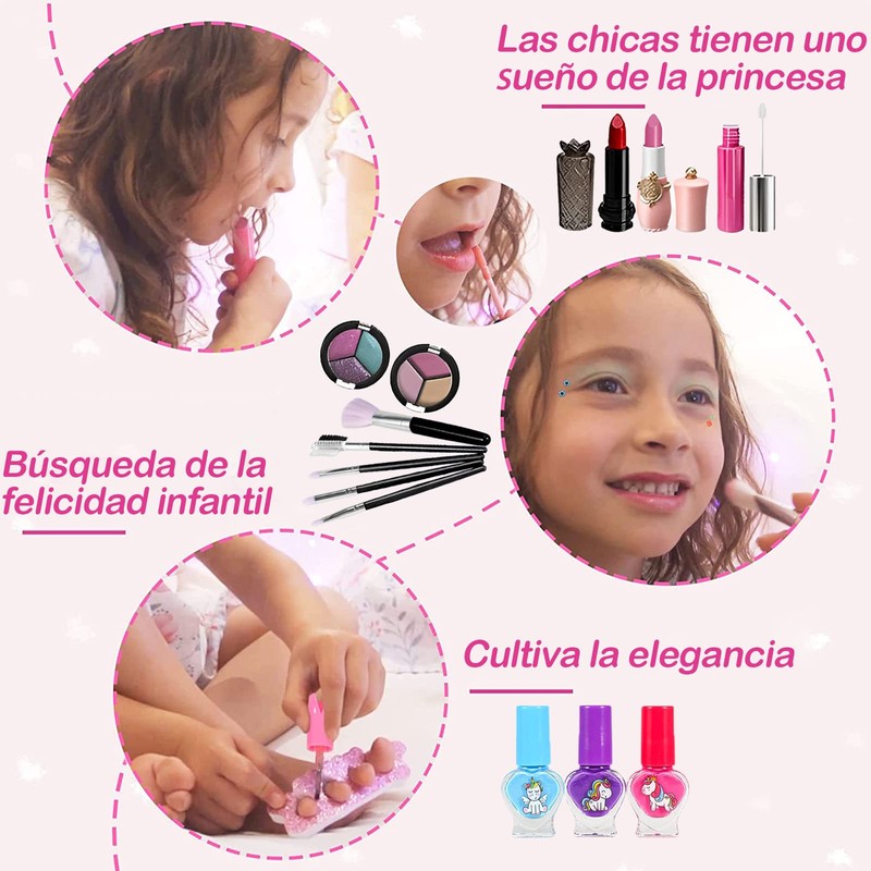 - 🎁【kit maquillaje para niñas de 27 piezas】Incluye brillo de labios, lápiz labial, polvo compacto, colorete, sombra de ojos, adhesivos para uñas, brocha de maquillaje, peine de maquillaje, esponja de maquillaje, borla para polvos, botella de spray vacía, separador de dedos, lima de uñas, y estuche de cosméticos, un total de 27 Piezas. Los niños pueden disfrutar de la verdadera diversión de disfrazarse.