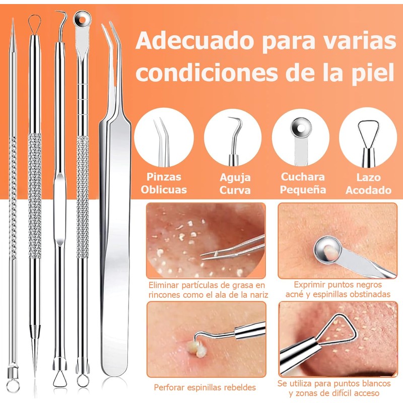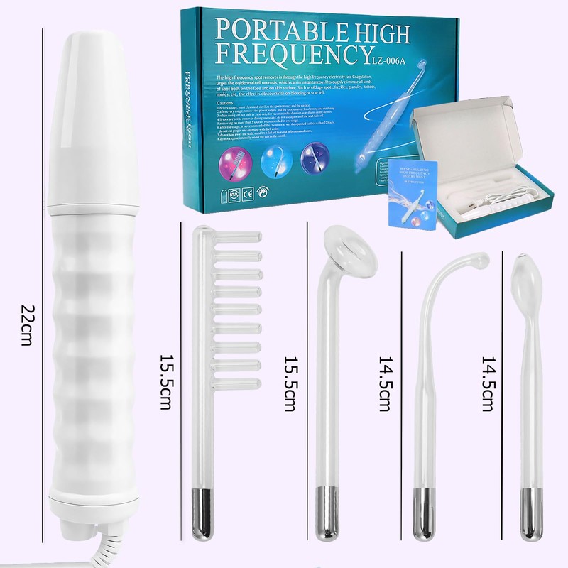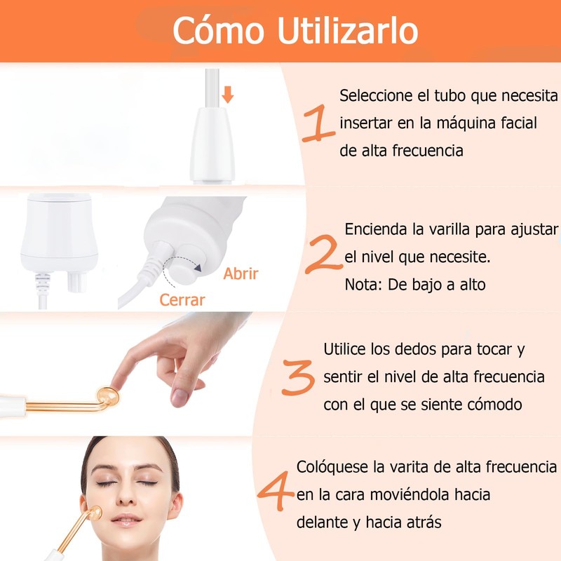 - Set Económico 5 en 1: Máquina Alta frecuencia facial y corporal ×1, Varitas (Seta/Lengua/Curva/Peine) ×4, Eliminador de Espinillas y Acné ×4, Manual de Instrucciones ×1. Este maquina de radiofrecuencia facial satisface sus necesidades en diferentes zonas