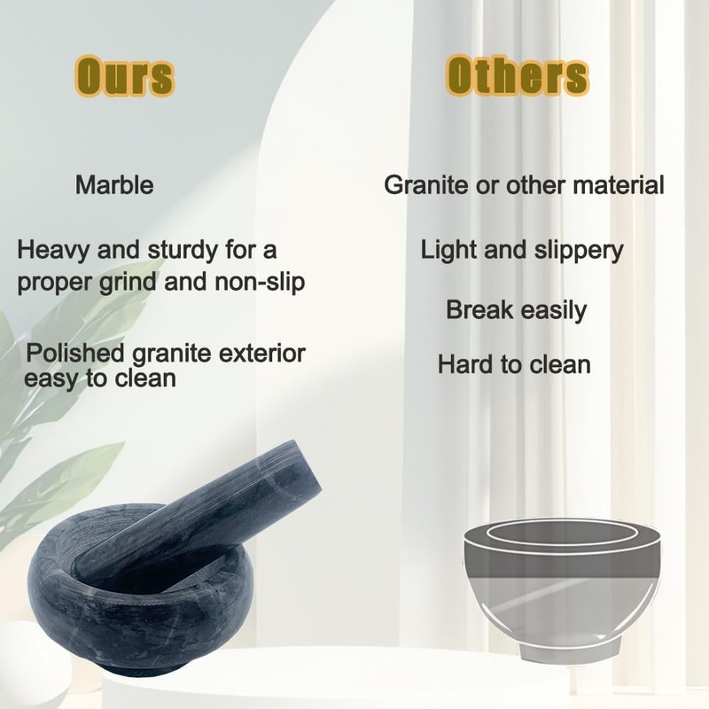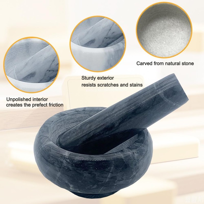 - 【Pure Natural Marble】The mortar and pestle are made of natural marble, and the interior of the spice grinder features a texture to increase friction. Our wide-end pestle has a large frosted surface, which effectively prevents food from splashing. The tail of the pestle is polished and will not scratch your palm. You can use it to make pesto, salsa and guacamole, seasonings,ground pepper, herbs, nuts, seeds, ginger root, etc.