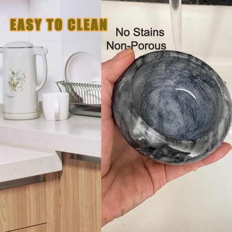 - 【Easy to Clean】Please note: Due to its natural marble composition, there may be some powder initially. To fix this, grind 1/3 cup of uncooked rice in a mortar and pestle, Just use a sponge to rinse the herb grinding bowl thoroughly in water without leaving any peculiar smell. Avoid using soap for the first cleaning.