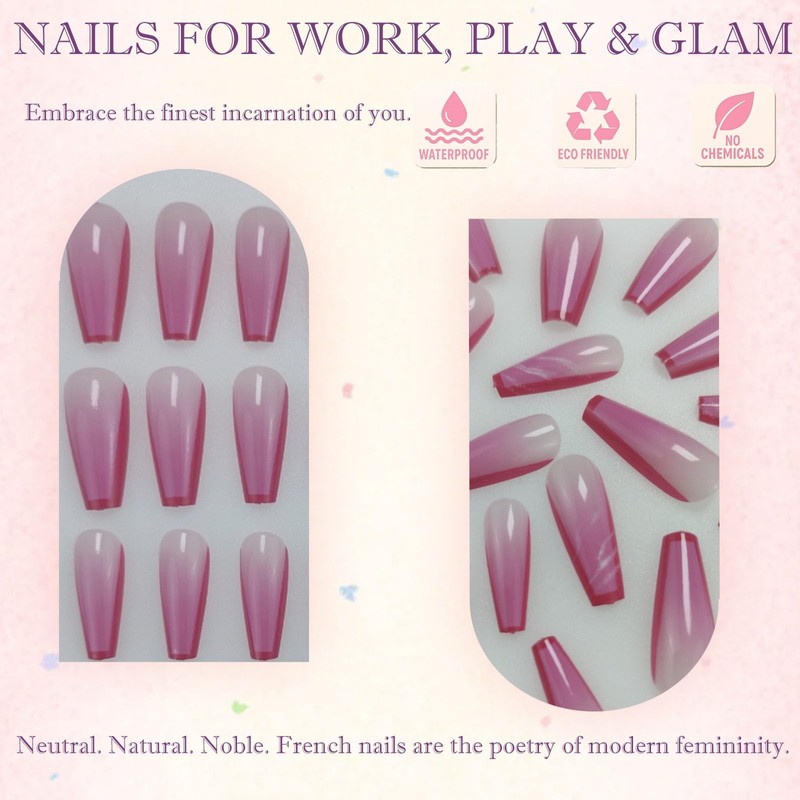 - 💫[Versatile Coffin Shape] Designed with a sleek coffin silhouette, these nails elongate fingers and provide a modern look. Their wide tip also offers plenty of room for unique art, stickers, or chrome overlays—perfect for stylish customisation.