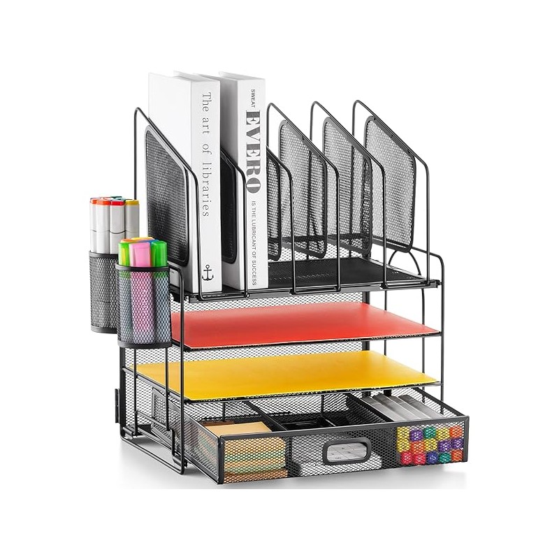 Marbrasse Desk Organizer with Drawer, 4-Tier Mesh Desk File Organizer with 5 Vertical File Holders and 2 Pen Holders, Multifunction Desktop Organizer