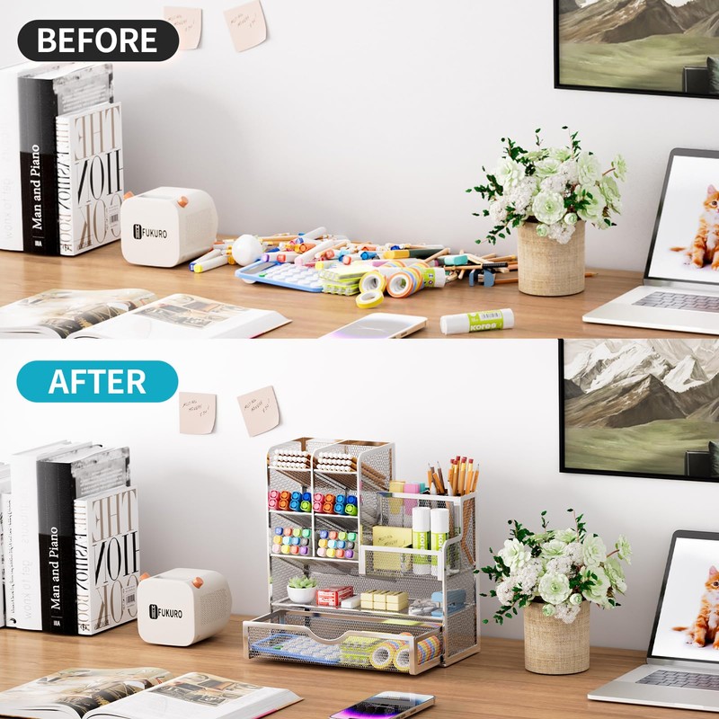 - 【VERSATILE & PRACTICAL 】This desk caddy is not only perfect for storing your desktop stationery such as pens, pencils, markers, rulers, erasers, paper clips, scissors, letter openers, and many other desk widgets but also great for storing your makeup brushes, nail polishes, lipsticks and other small personal items sorted by type, which makes it way easier to find what you need! and You can put any other daily necessities on the organizer, It helps you keep your stuff organized