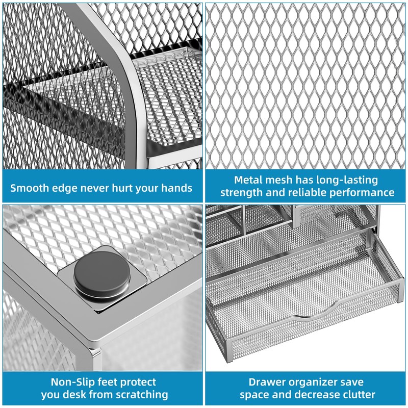 - 【STURDY AND DURABLE】The desk storage is made of high-quality metal mesh and built with non-skid feet to make it incredibly stable, which is not easy to get rusty and thereby, keeping the pen holder brand new all the time. The extremely smooth edges will not hurt your things or yourself. for meeting all your demands for home and office use
