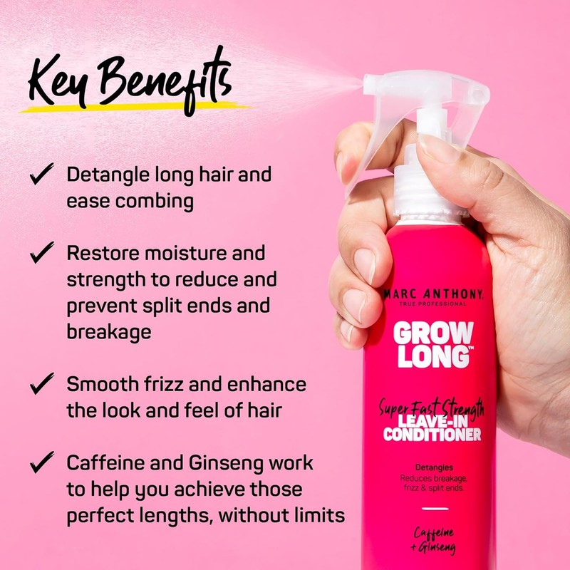 - Grow Long Super-Fast Strength Leave-In Conditioner: With Caffeine, Ginseng, and Vitamin E, this Leave-In Conditioner from Marc Anthony detangles, smooths frizz, and gives hair the strength it needs to help reduce split ends and breakage. 8.4 fl oz.