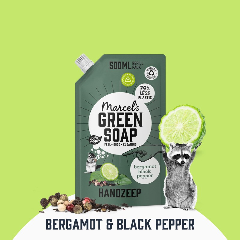 - Marcel's Green Soap Hand soap black pepper & bergamot is 97% biodegradable and enriched with extra vegetable glycerine that ensures super soft hands.