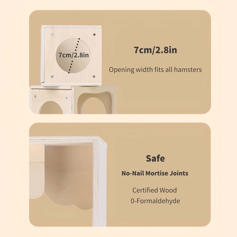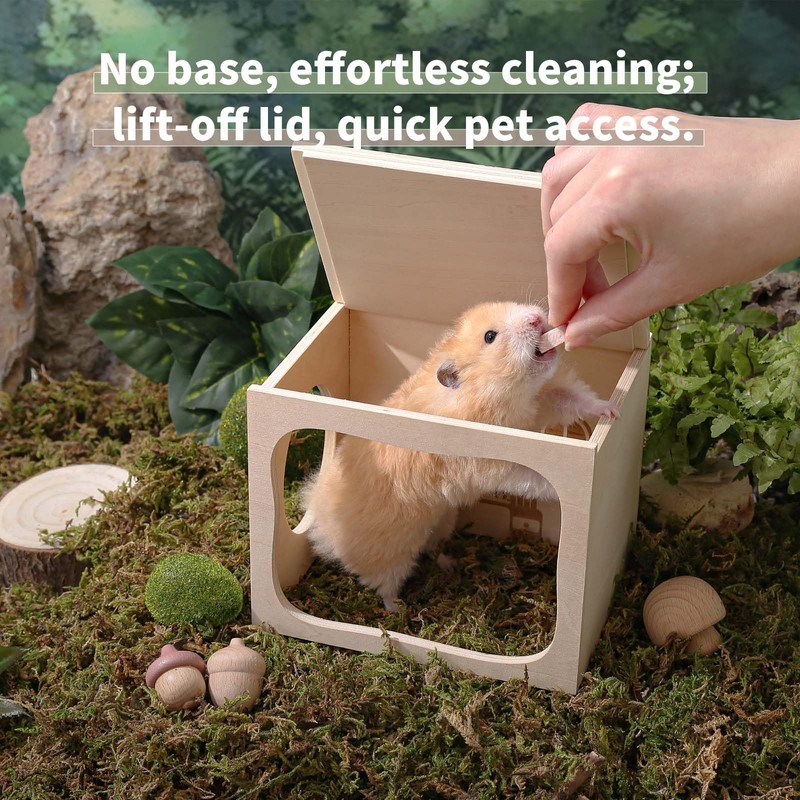 - Natural wood texture:Selected unpainted natural wood with warm textures and a natural vibe, replicating the original wild habitat of hamsters. Compared to the cold feel of plastic cages, the wooden texture can reduce pets' stress reactions, allowing the little ones to nap peacefully and store food in a familiar atmosphere, as if living in their own exclusive little nest in the forest.