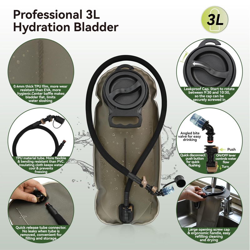 - Professional 3L Hydration Bladder: Made of 100% BPA free, tasteless TPU. Quick release valve allows you to refill water without connecting hose. Large opening is easy to clean and add ice cube. 360 degrees rotatable mouthpiece allows for easy drinking. Shut On/Off valve helps to adjust water flow. Middle baffle keeps the bladder flat and makes it easier to place into the backpack.