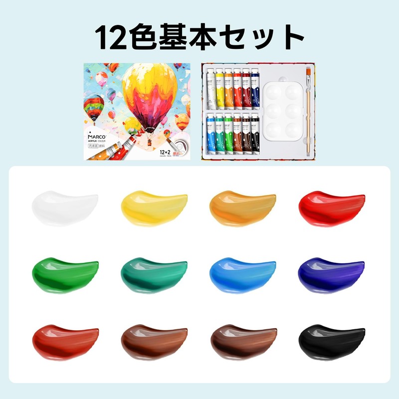 Marco Acrylic Paints, 12 Colors, Brush Palette Included, Acrylic Gouache Quick Drying, Waterproof Paint Set, Compatible with Cloth/Wood/Stone/Ceramics, Illustration, Craft, Handmade, Kids, Elementary