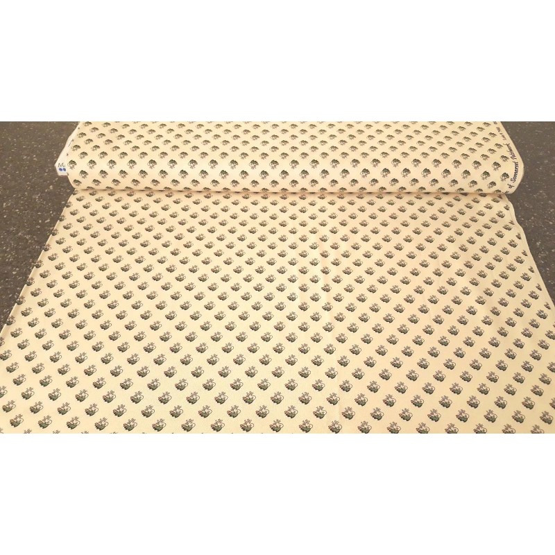 Floral print in green, gold and black on a solid ivory background.