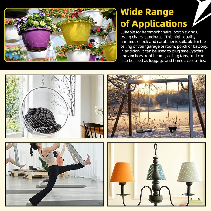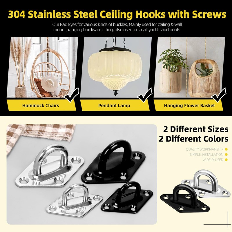 - Wide Application Our pad eye U hooks and carabiner hooks are widely used for concrete ceilings, brick walls, wooden ceilings, boats, hanging plants, chandeliers, wire ropes, chains, heavy duty posts, decks and so on. Perfect for quick connections of various buckles, small yachts and boats, and indoor or outdoor installation, adding convenience to your life.
