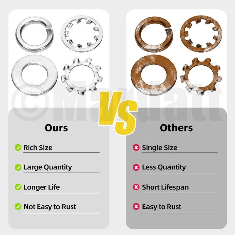 • 4️⃣Wide Application: Our multi-type lock washer packages, spring washers are highly compatible with screws, nuts and bolts of the same size, perfect for electrical connections of household and commercial appliances, interior decorations, outdoor construction and furniture repairs, etc. Suitable for both indoor and outdoor use, a good helper in your daily life.