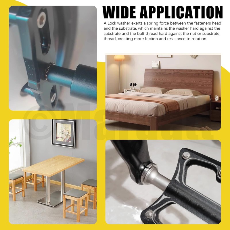 • 3️⃣Feature: Our lock washers can be used with all kinds of screws, nuts and bolts to prevent nuts, bolts and screws from rotating and loosening due to vibration and friction, preventing loosening and fixing objects to ensure the stability of machines. They protect the substrate from damage during fastening and loosening, extending the life of the equipment.