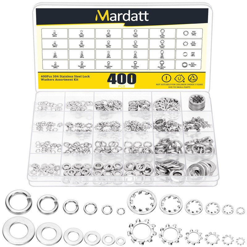 • 1️⃣Package Included: You will receive 400pcs stainless steel metric lock washer assortment in 4 types and 6 sizes(M3 M4 M5 M6 M8 M10), which includes 100pcs flat washers, 100pcs split lock washers, 100pcs internal tooth lock washers, 100pcs external tooth lock washers, come with a plastic case, a complete assortment and sufficient quantity for your convenience.