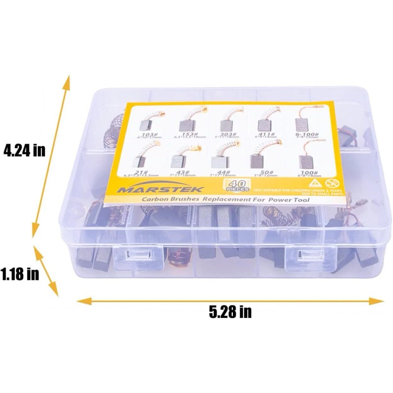 • 【Package Contains】:40Pcs 10 sizes carbon brushes, each size 4Pcs(7x17x19mm, 5x11x18mm, 6.5x7.5x13mm, 6.5x13.5x18mm, 6x10x17mm, 6x9x14mm, 7x11x18mm, 6x8x14mm, 5x8x13mm 5x8x15mm).