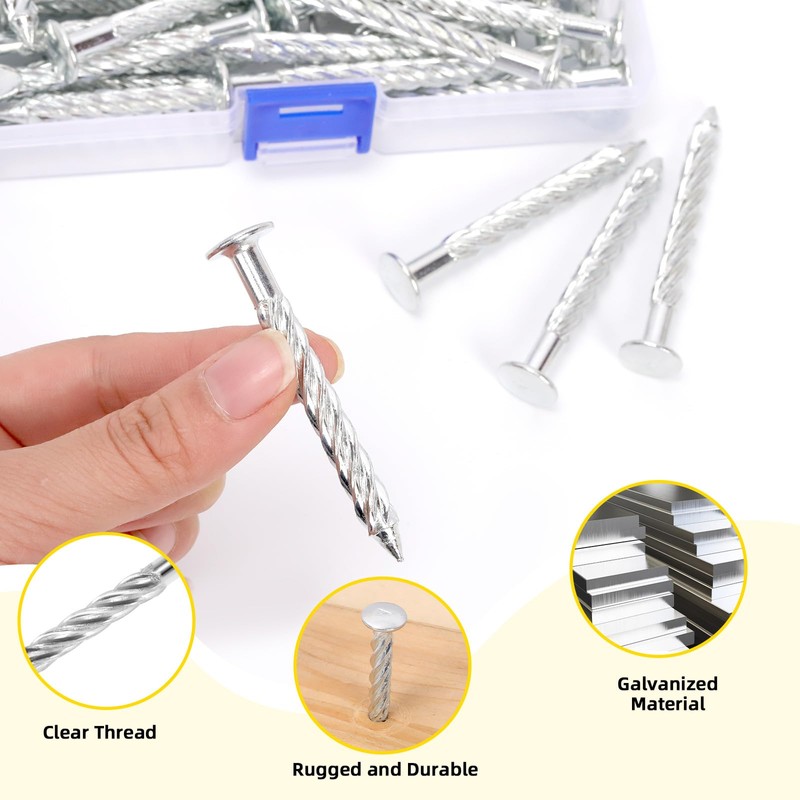 - 3️⃣ Spiral Design: Thread twist nails are equipped with a spiral design, these nails hold stronger by digging deeper into the surface, woodworking nails are not easily bent or pulled out. The nails' top caps feature a small diameter, keeping them hidden from view. As such, you can be assured the nails will not disrupt the appearance or performance of your work.