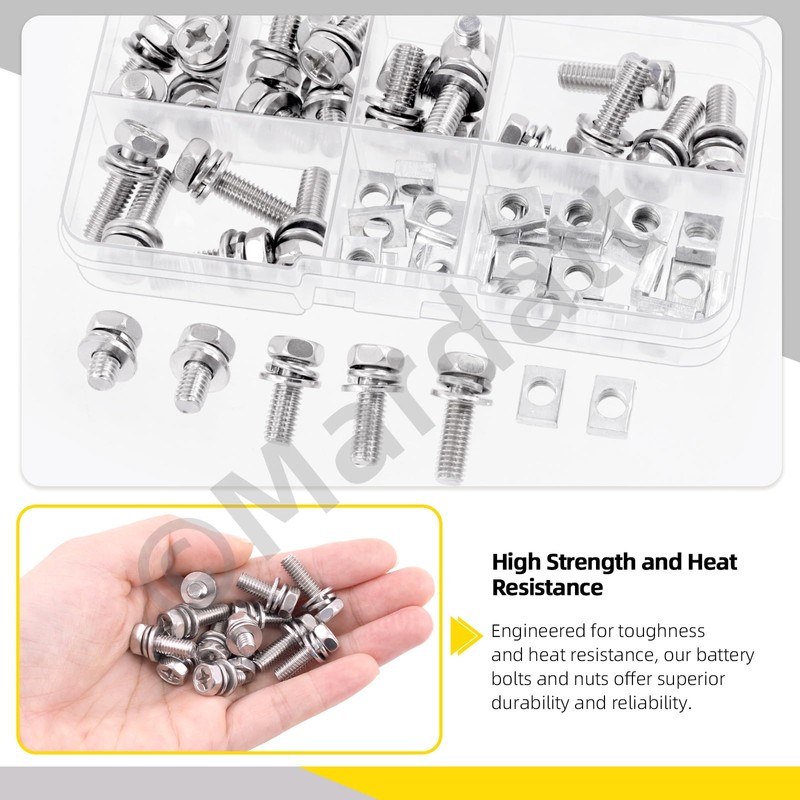 - 【Wide Applications】Mardatt motorcycle battery terminal nuts and bolt kit is not only compatible with motorcycle batteries, but also suitable for a variety of applications, such as woodworking, home improvement, furniture repairs and some DIY projects, essential for all your fixing needs.