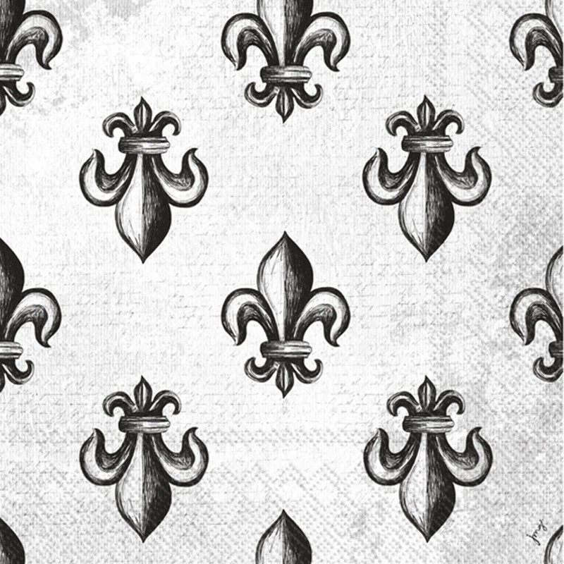 - Design features a pattern of black Fleur de Lis on a faded gray background