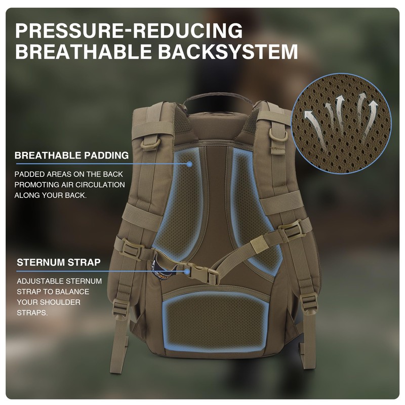 - Molle extension: Molle webbing and stretch drawstring on the front of the military backpack provide powerful extension options. It can easily attach tactical equipment, tool kits and other accessories to meet personalised travel needs.