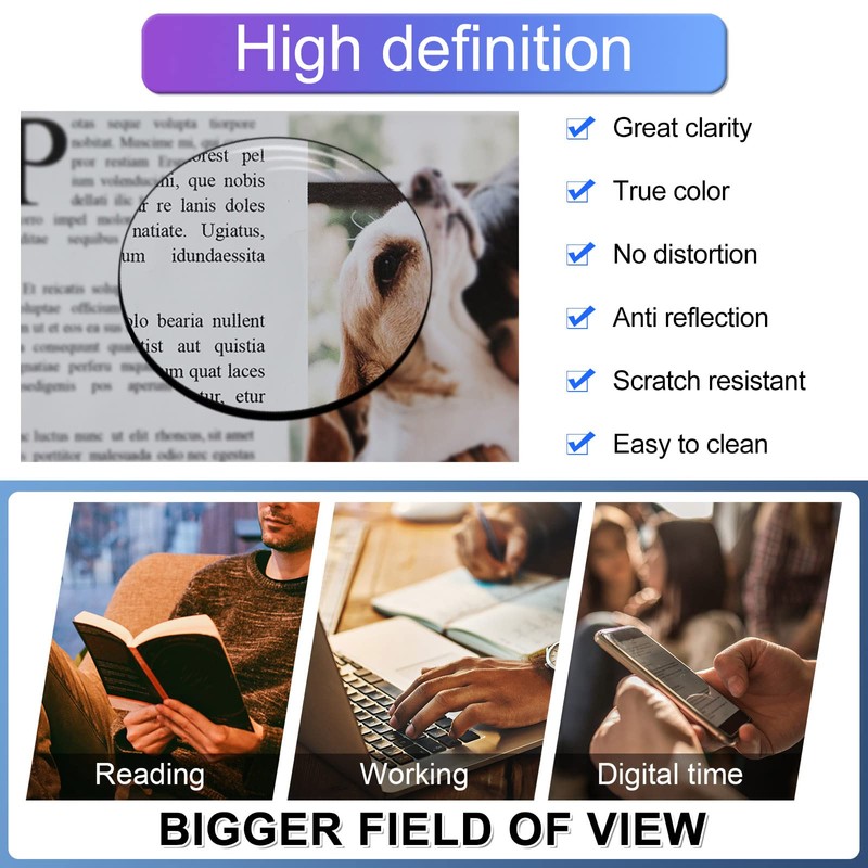 - Clear visual enjoyment: Thinner and durable, multi-layer coating, sturdy & high quality lenses give you clear and natural vision; lightweight & scratch resistant; has higher precision as well, with 1.00+ to 6.00+ magnifying lens for you to choose, just enjoy your digital time more clearly and easily at the office, home, party, in bed or car.