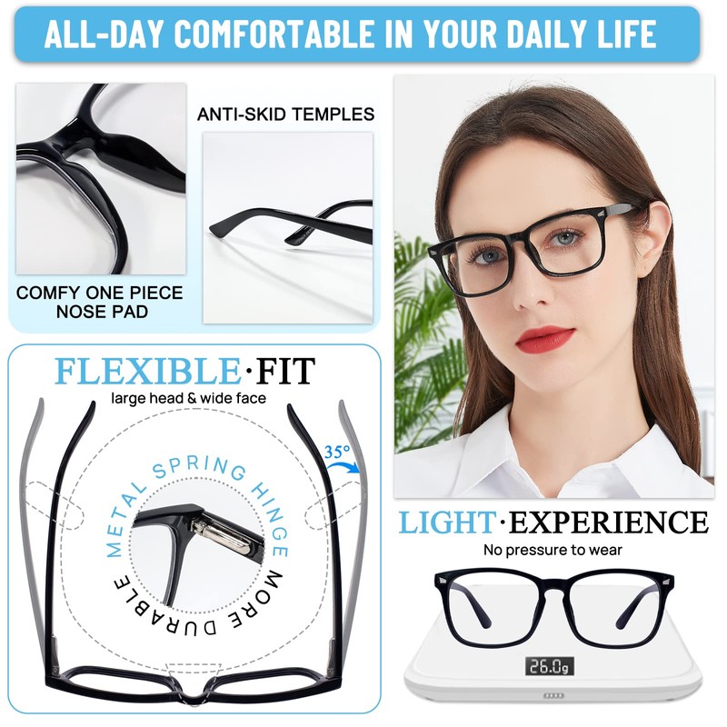 - LIGHTWEIGHT COMPUTER READERS: Ultra-light designer reading glasses is cute, fashionable and cool modern style. The sturdy metal spring hinge - flexible opening and closing, suitable for all face shape. Clear magnifying lenses - easy to clean, and perfect for reading, gaming or enjoying digital time at the office or party, at home, in the park or in bed!