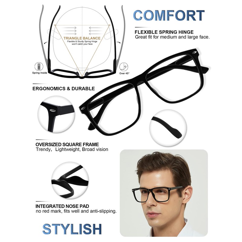 - Comfortable fit: With flexible spring-hinge fits well for medium, or big face, won’t pinch head for a all-day comfort. Lightweight and extra large square frame give you a broad vision without turning neck to magnify small print easily. Ideal for male size: Frame width: 5.67”/144mm, Bridge: 0.71”/18mm, Lens width: 2.17”/55mm, Lens height: 1.77”/45mm, Temple length: 5.71”/145mm.