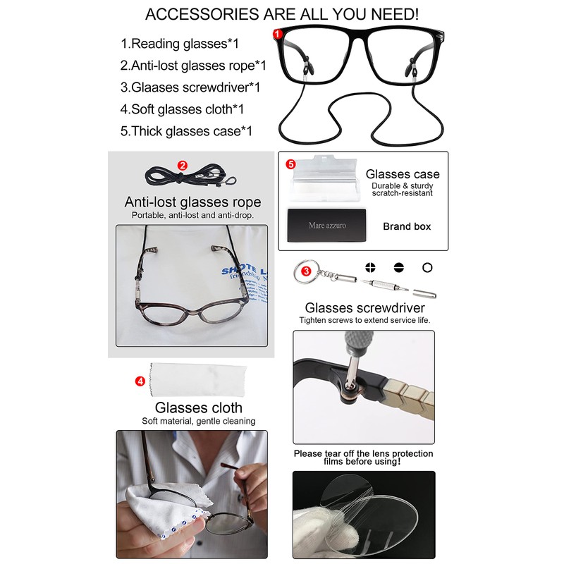 - Super value: Large reading glasses for men 150 *1; Glasses screwdriver*1; Anti-lost glasses rope*1; Glasses case*1; Soft cloth*1; Packaged in brand box as a beautiful gift for father, husband, friend or charming yourself!