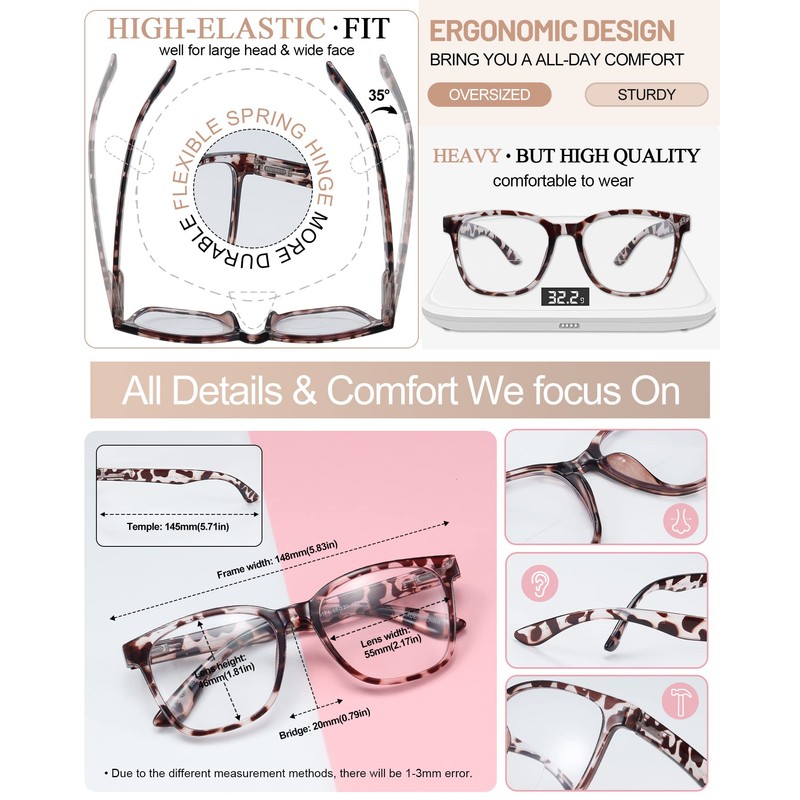 - Comfortable fit - crafted by high-quality frame with oversized square shape, bring you a broader vision and more fresh snazzy look. Also with flexible spring hinge, so ideal for wide face or large head, won’t pinch you. Full ergonomic temples and non-slip one-piece nose pad, no pressure, no red marks, to ensure your all-day wearing comfort.