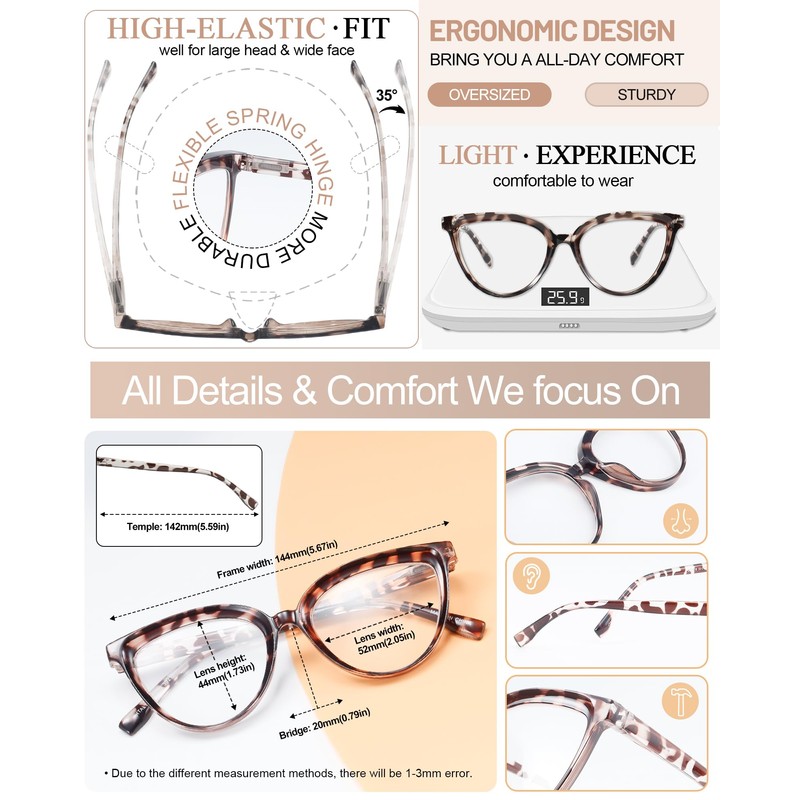 - 【 Comfortable design 】 crafted by high quality frame, accurate magnified lenses and big look, it provides great clarity and pleasant charm for daily wear. With flexible spring hinge also fits well for larger head or wider face. Also non-slip one-piece nose pad, ergonomic temples and a bigger vision without turning neck for a all-day comfort.
