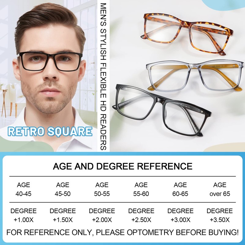 Men's retro square magnifying glasses for reading, working, enjoying digital time, gaming, watching TV/video, writing, studying, shopping, cooking, meeting.