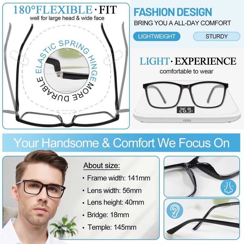 - Large reading glasses for men 1.50 - fashion big square readers with 180° flexible spring hinge fit well for larger head and wider face, bring you a broader HD vision while showing your high-end taste and handsome look. Designer reading glasses at a great price with exquisite gifts, has accurate +1.00 to +6.00 magnification to meet your daily need.