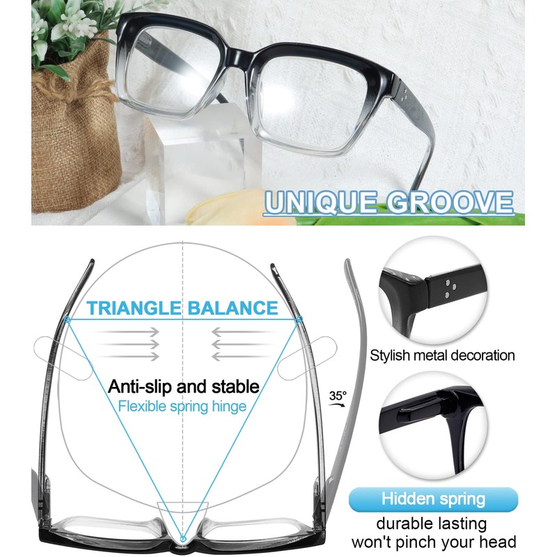 - Comfortable fit - Crafted by high quality frame, classy squares style, HD magnified lenses, well-designed and hand-made to give you all-day comfort. With flexible spring hinge, won’t pinch your face; fixed by firm screws, not easy to break. Full ergonomic temples and non-slip one-piece nose pad, no pressure, no red marks, so comfy.