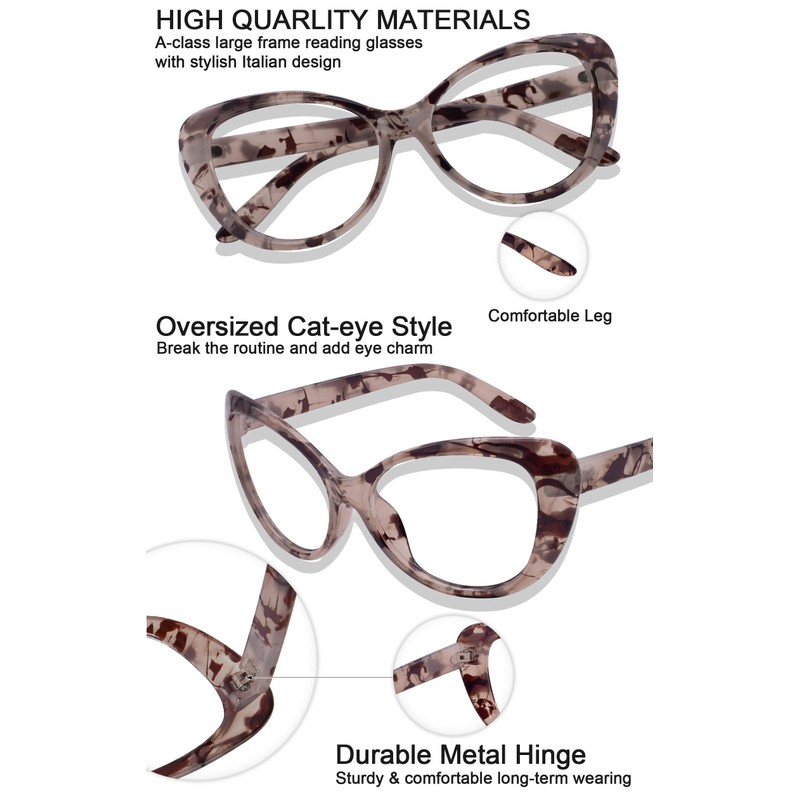 - OVERSIZED CAT EYE 1.0 READING GLASSES WOMEN: The funky reading glasses with Classic vintage cat eye full frame design is suitable for all face shape and makeup. Different with other normal reading glasses, oversized frame design will not hinder your vision to reading, watching TV, or using a mobile phone, and make your face smaller.