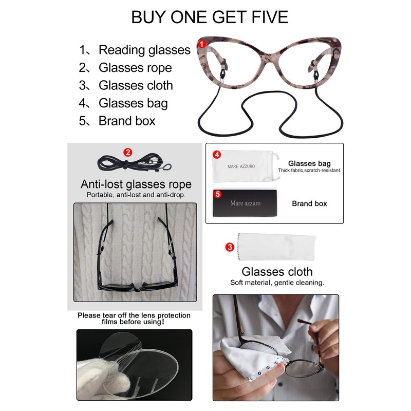 - 30-DAY AFTER-SALES and LIFETIME WARRANTY- Package Included: 1*reading glasses, 1*Anti-lost glasses rope(worth $2.5); 1*free glasses bag & dust cleaning cloth(worth $3 ,to avoid the lens being scratched).1*Black brand packaging box as a beautiful gift; In case of any problems within 30 days, please contact with our customer services without hesitation.We will provide the best solutions until the customer is satisfied.You have no risk to try!