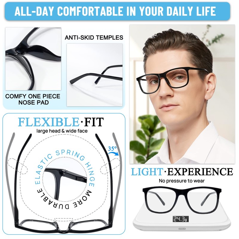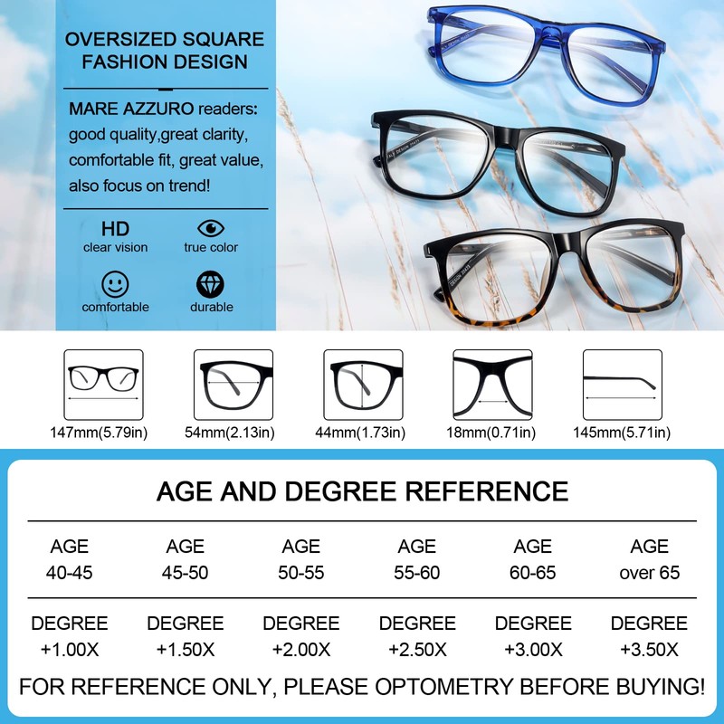 - Retro oversized design - large square readers for men with 3 stylish color matching( classic black, vintage blue and stylish black+tortoise), let you look more fresh and youthful in your business and casual outfit. Size: frame width: 147mm; lens width: 54mm; lens height: 44mm; bridge: 18mm; temple length: 145mm.
