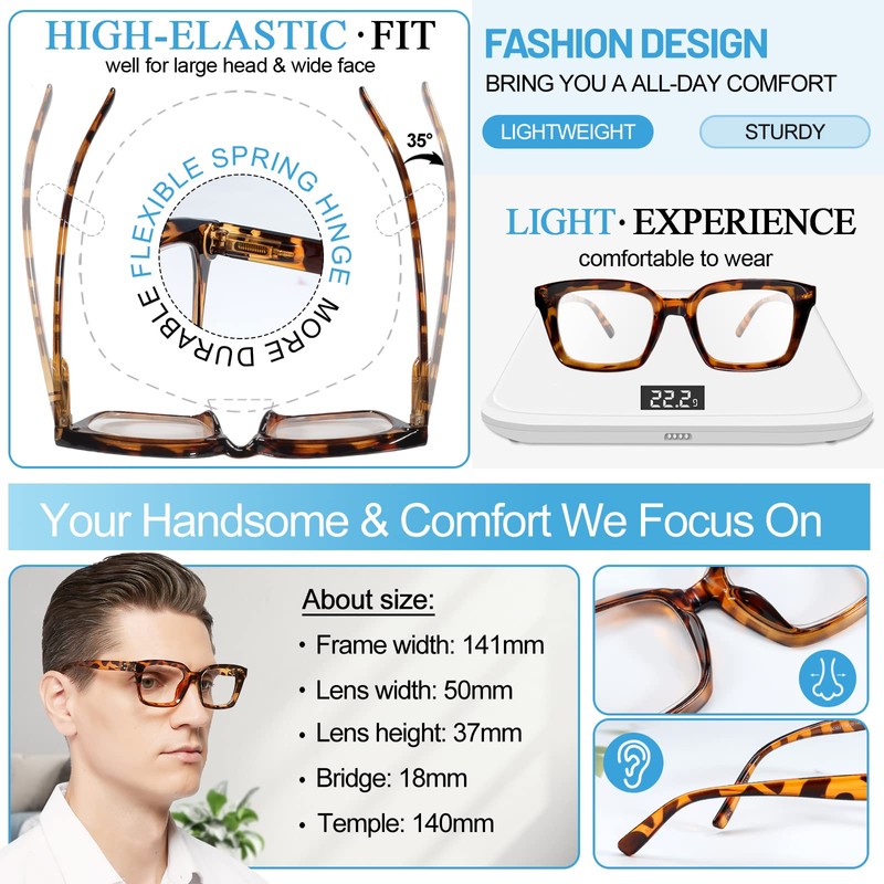 - High definition vision - A-class magnifying glasses for reading 125 has higher precision to read small print easily, good transmittance, reduce reflection & scratch resistant, easy to clean. Oversized square reader glasses ensures true color, no blur and or distortion, bigger field of view without turning your neck to easily get a clear vision.